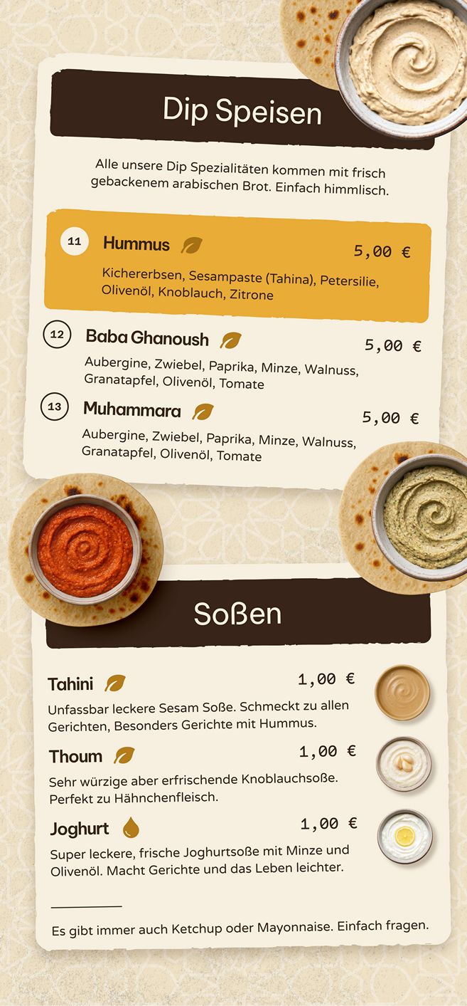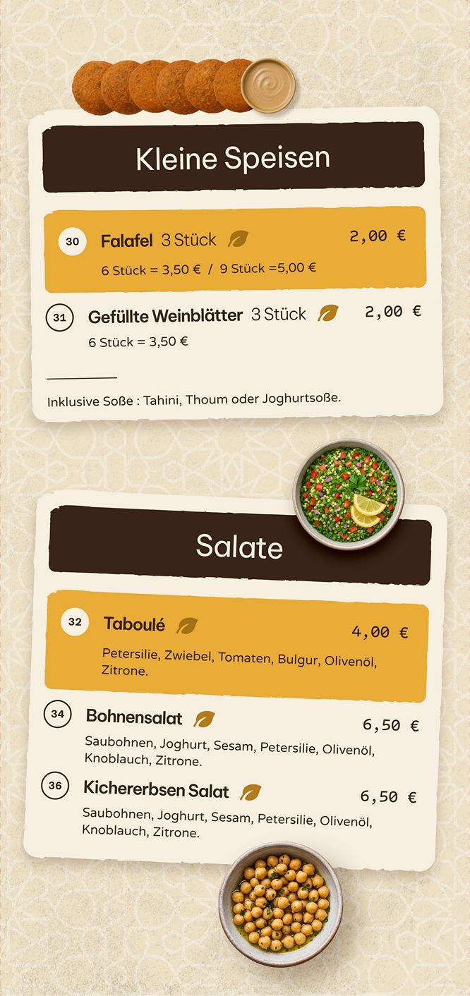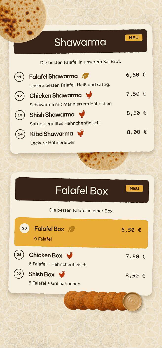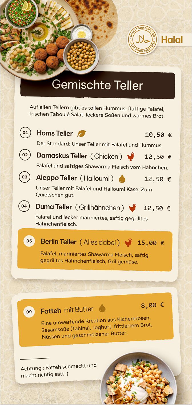 Genieße authentisches, syrisches Essen. Unsere Falafel sind fluffig und saftig. Probiere unsere gemischten Teller. Wir empfehlen unseren Berlin Teller. Da ist von allem etwas dabei. Und für den schnellen Hunger oder für unterwegs, gönn dir eine Falafel Box. Mit oder ohne Fleisch.